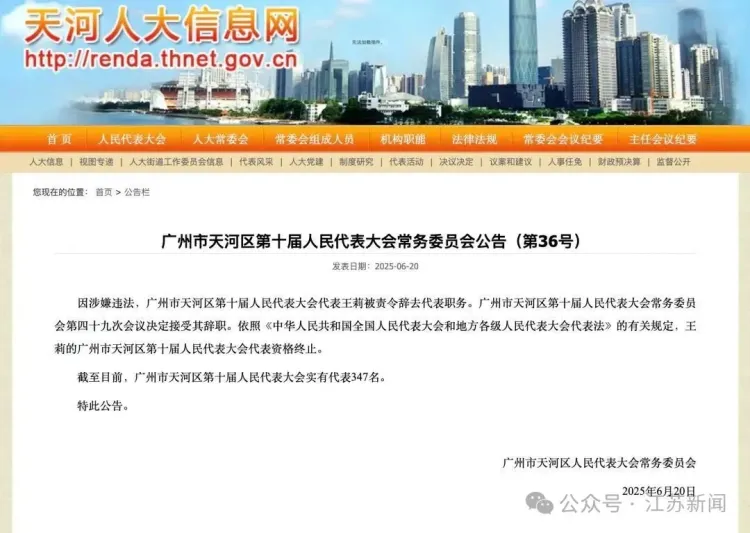6月20日下午,广州市天河区人民代表大会常务委员会发布公告,因涉嫌违法,广州市天河区第十届人民代表大会代表王莉被责令辞去代表职务。广州市天河区第十届人民代表大会常务委员会第四十九次会议决定接受其辞职。依照《中华人民共和国全国人民代表大会和地方各级人民代表大会代表法》的有关规定,王莉的广州市天河区第十届人民代表大会代表资格终止。
